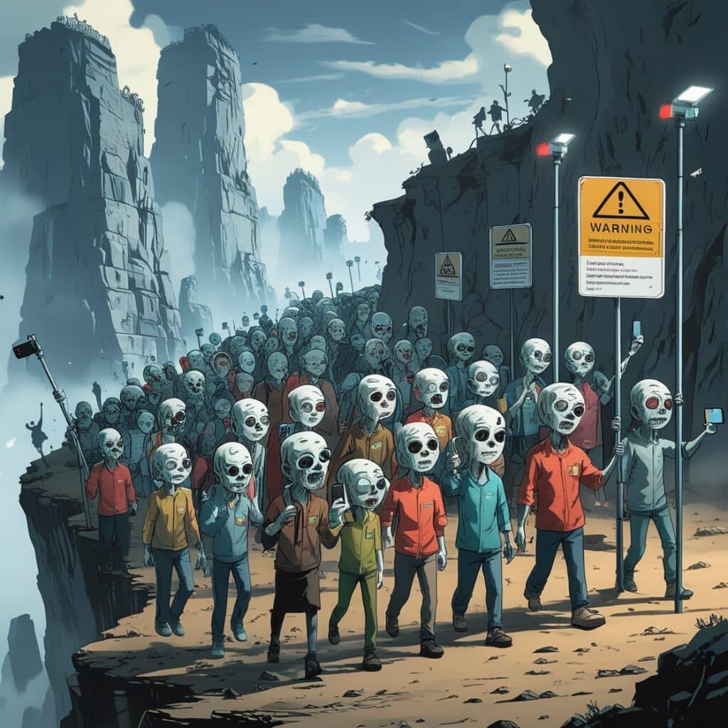 Résultat : la population mondiale chute à 3 milliards, victimes d’une obéissance absurde validée par les algorithmes, tandis que la recette du dentifrice à l’arsenic et les selfies le long du littoral continuent de faire des ravages.